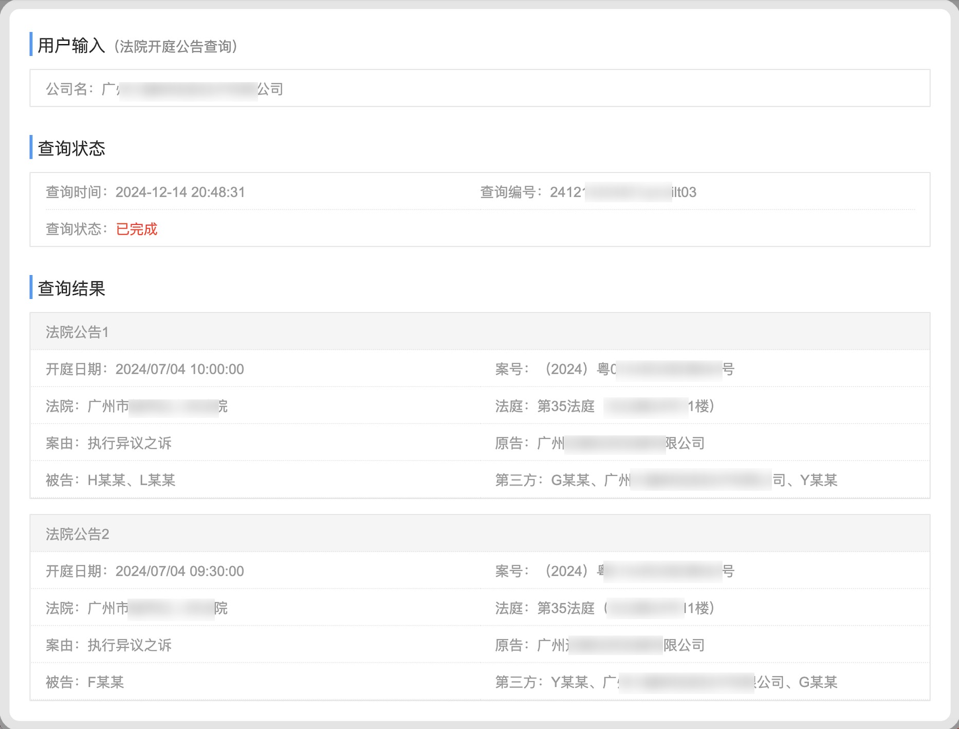 3、查询结果示例;(如下图所示,图3-1为法院开庭公告结果示例,图3-2为企业法院公告结果示例)